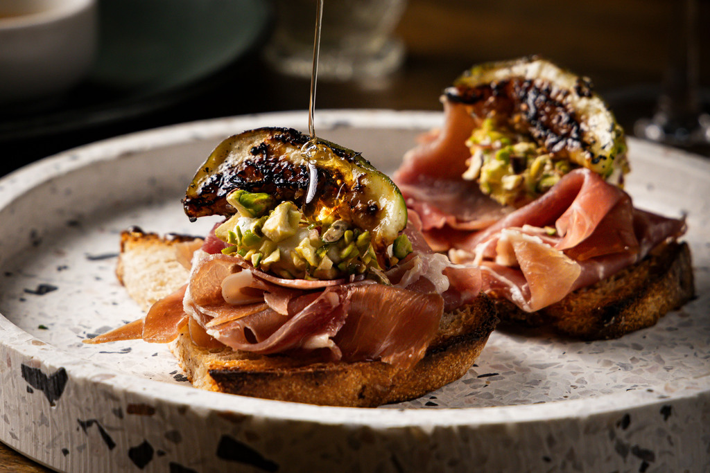 A experiência começa com duas entradas cheias de personalidade: a Bruschetta di prosciutto e pistacchio, feita com pão italiano, presunto de Parma, pistache triturado e queijo boursin, e o Brandacujun, receita tradicional da Ligúria que combina brandade cremosa de bacalhau com batatas, azeitona taggiasca e salada verde.