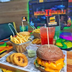 O ambiente é super descontraído e repleto de referências à cultura pop. Enquanto saboreia lanches criativos e saborosos, é possível aproveitar os fliperamas retrô e videogames disponíveis no espaço, tornando a refeição ainda mais divertida.