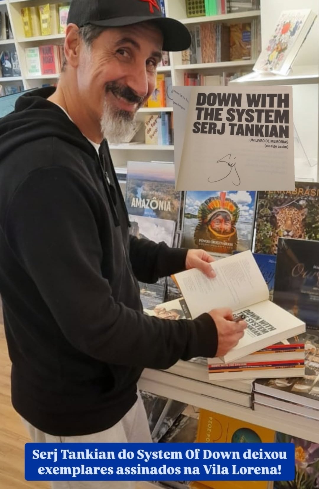 No ano passado, o vocalista Serj Tankian publicou a sua autobiografia “Down with the System: Um livro de memórias (ou algo assim)”. Celebrando o aniversário de um ano de lançamento, na última quinta-feira (15), o cantor deu uma passadinha na Livraria da Vila localizada no Jardim Paulista para autografar alguns exemplares.