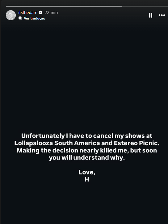 “Infelizmente, eu preciso cancelar meus shows no Lollapalooza América do Sul e no Estéreo Picnic. Tomar essa decisão quase me destruiu, mas em breve vocês vão entender o motivo.