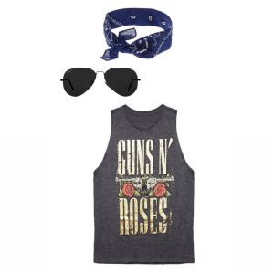 Em breve no Brasil com a mega turnê do Guns N’Roses, Axl Rose já pode começar a tomar a tomar as ruas do país! A fantasia do vocalista é uma das mais simples para viver o Carnaval no conforto: bandana, óculos escuro e camiseta de banda.