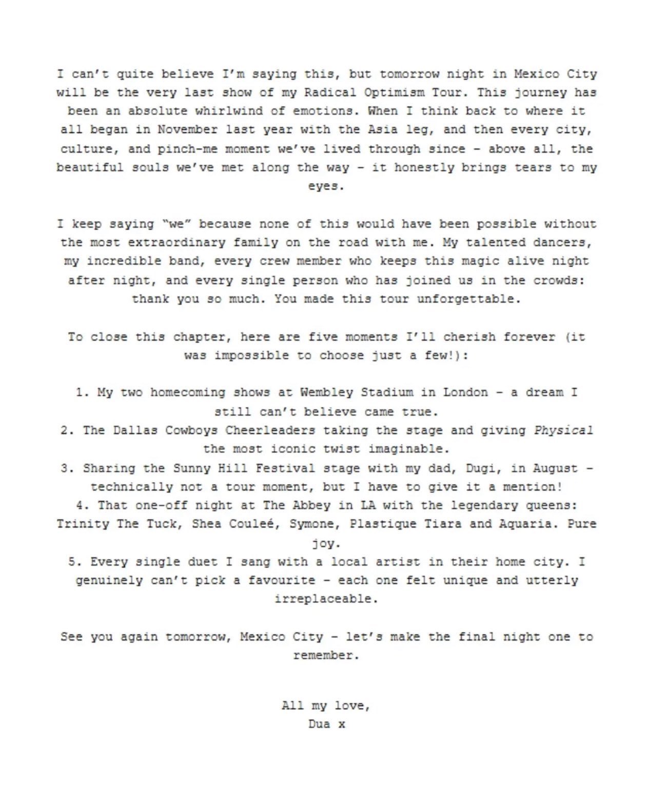 Até amanhã, Cidade do México — vamos fazer da última noite uma lembrança inesquecível. Com todo o meu carinho, Dua x.”