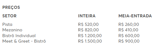Ingressos para todos os shows já estão à venda no site da Ticketmaster Brasil. No caso da capital paulista, os preços são os seguintes: