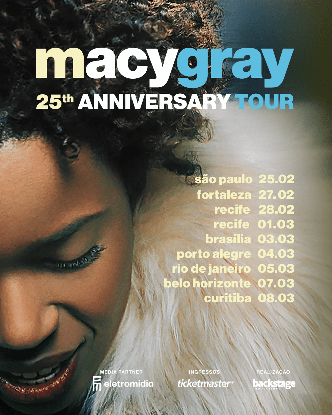 Macy Gray, ícone do R&B, voltará ao Brasil. A dona dos hits “I Try” e “Still” anunciou nove shows no país, marcadas entre fevereiro e março de 2026. Ao todo, a artista passará por São Paulo, Fortaleza, Recife, Brasília, Porto Alegre, Rio de Janeiro, Belo Horizonte e Curitiba, como parte da “25th Anniversary Tour”.