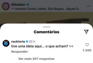 Justin Bieber poderá vir ao Brasil em breve? A conta do Rock in Rio fez um comentário misterioso em uma publicação recente do cantor. “Tive uma ideia aqui… o que acham?“, escreveu a equipe do festival.