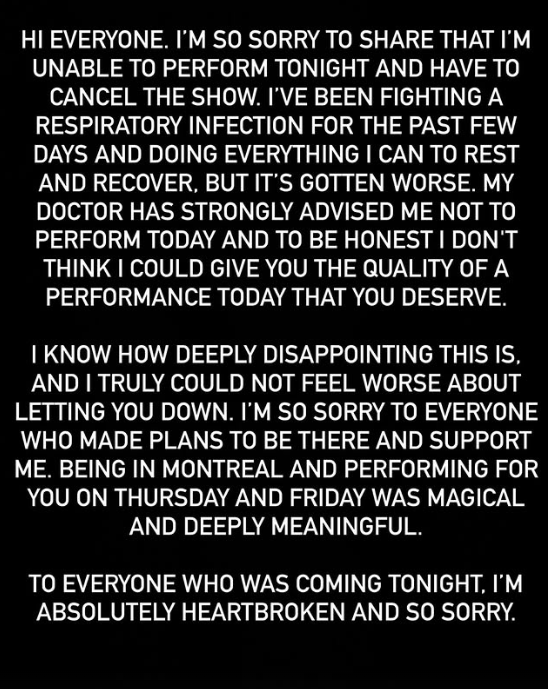 “Oi, pessoal. Sinto muito em compartilhar que não poderei me apresentar esta noite e que terei de cancelar o show. Estou lutando contra uma infecção respiratória nos últimos dias e fazendo tudo o que posso para descansar e me recuperar, mas a situação piorou. Meu médico me aconselhou fortemente a não me apresentar hoje e, para ser honesta, não acredito que conseguiria entregar a qualidade de performance que vocês merecem.