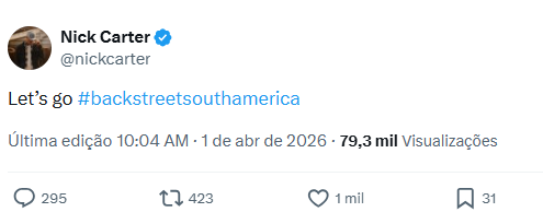 Por meio do X/Twitter nesta quarta-feira (1), o artista publicou uma série de hashtags que sugerem os próximos destinos do grupo. Uma das postagens dizia: “Vamos lá #backstreetnaamericadosul”. Por enquanto, uma parcela dos fãs levou a publicação na brincadeira, devido ao 1º de abril.