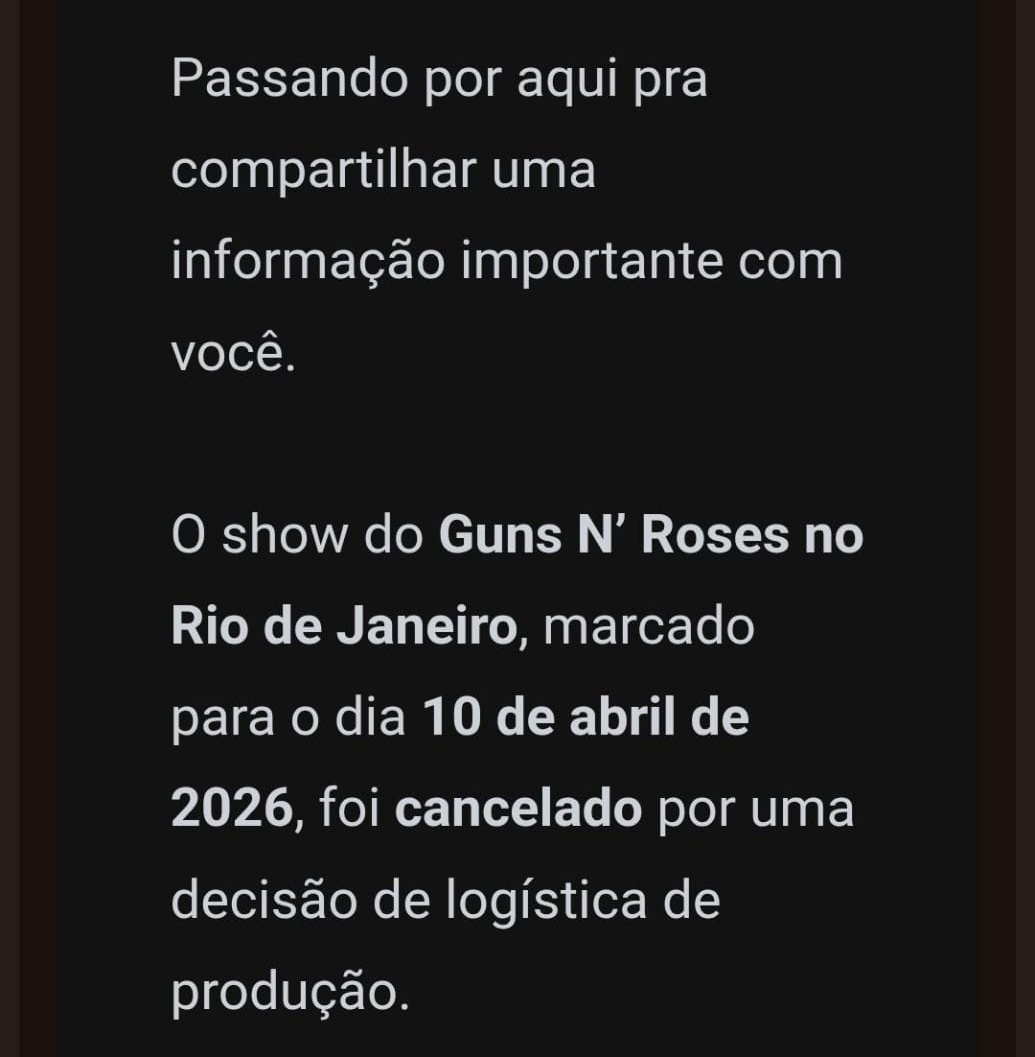 “O show do Guns N’ Roses no Rio de Janeiro, marcado para o dia 10 de abril de 2026, foi cancelado por uma decisão de logística de produção. O reembolso do ingresso já foi