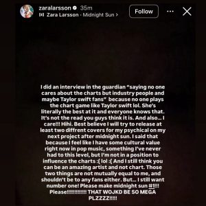 A declaração deu o que falar nas redes sociais, e swifties começaram a questionar Zara, que já havia mostrado o desejo de liderar as paradas no passado. Para rebater as críticas, ela fez uma publicação temporária nas redes sociais, afirmando que essa “não é a crítica que vocês pensam que é”.