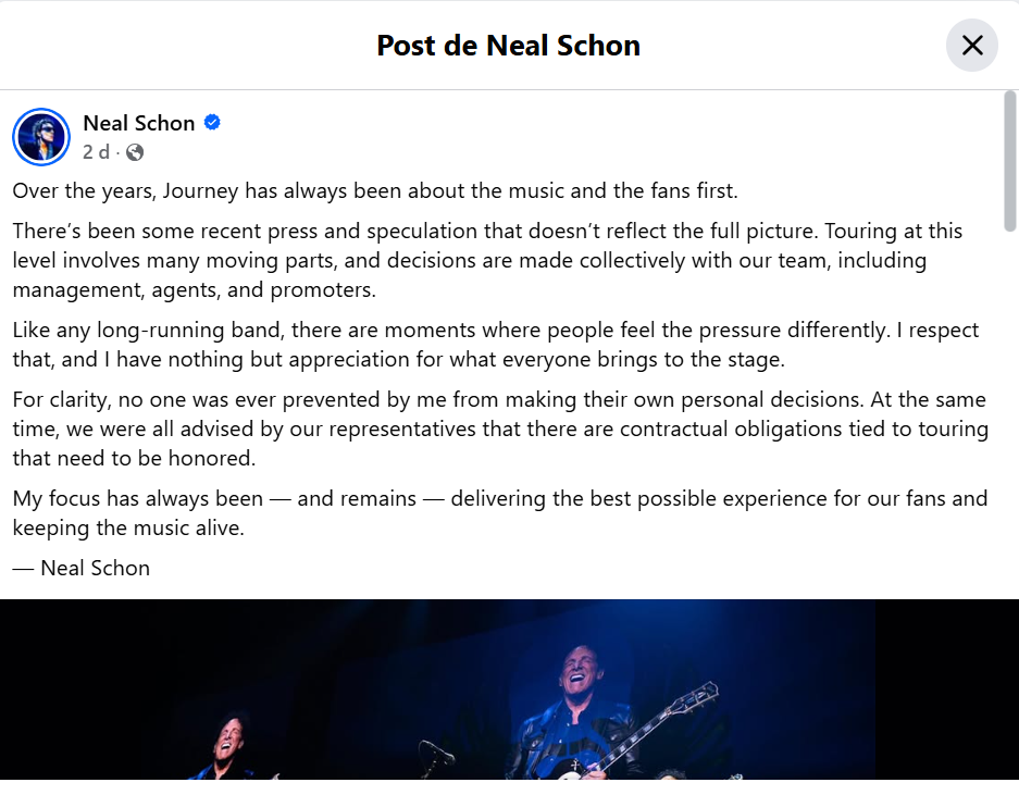“Como qualquer banda de longa data, há momentos em que as pessoas sentem a pressão de forma diferente. Eu respeito isso e tenho o maior apreço por tudo o que cada um traz para o palco. Meu foco sempre foi — e continua sendo — proporcionar a melhor experiência possível para nossos fãs e manter a música viva”, continuou Neal no post.